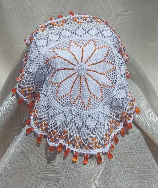 Material: White crochet thread, adorned with orange and grey beads forming the pattern, and orange teardrop beads along the border